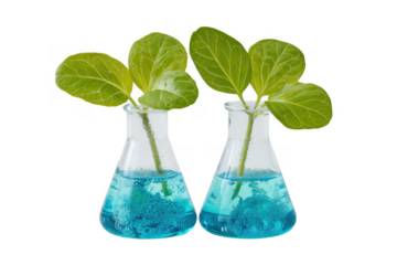 Two labotatory test glass container beakers with blue liquid test samples , minimum shadow isolated on a transparent background