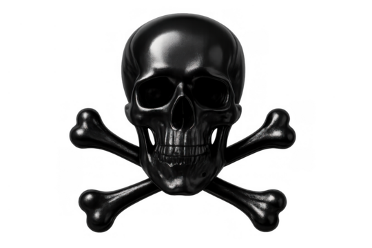 Black glossy skull and crossbones symbol representing danger, poison, and mortality. Transparent background