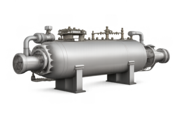 Industrial pressure vessel on transparent background; metal storage tank with pipes, valves, and gauges for chemical processing