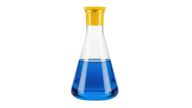 Isolated Erlenmeyer flask with blue liquid and yellow stopper for experiments and lab work