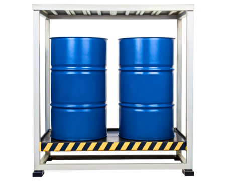 Two blue chemical barrels on an industrial spill containment pallet on a transparent background