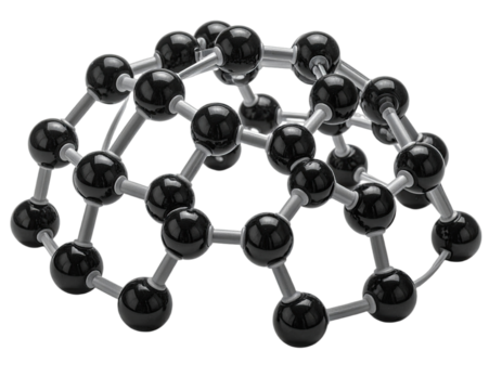 Three-dimensional, spherical structure composed of interconnected spheres and rods against black