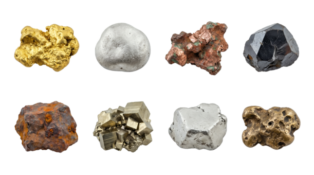 Raw mineral and metal ore set including gold, silver, copper, pyrite, and hematite specimens isolated. Geological collection for science and jewelry industry.