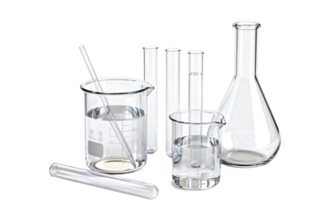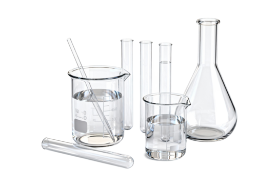 Colorful laboratory glassware and equipment set including beakers, flasks, test tubes, and a burette isolated on transparent background