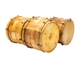 Two Cylindrical Wooden Folk Drums with Patchwork Wood Grain, Isolated on White