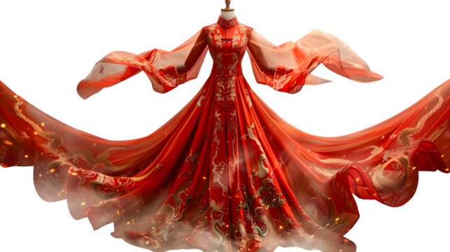 A beautiful red silk Cheongsam dress with intricate embroidery, isolated on a transparency background