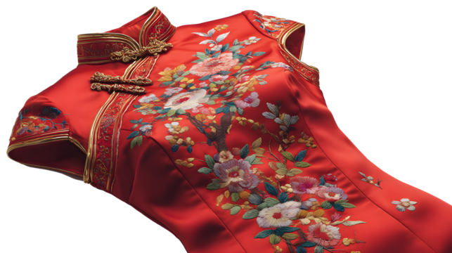 A traditional red cheongsam featuring intricate floral patterns, exemplifying cultural heritage and elegant design. Perfect for celebrations or cultural events.on transparent background