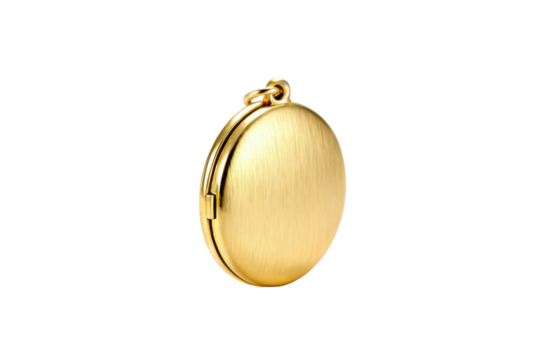 A luxurious brushed gold oval locket pendant with intricate detailing, isolated on a deep transparent