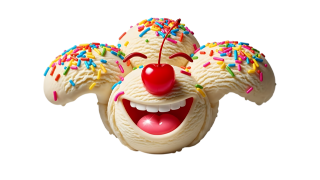 Delightful ice cream face with cherries and sprinkles isolated on transparent background