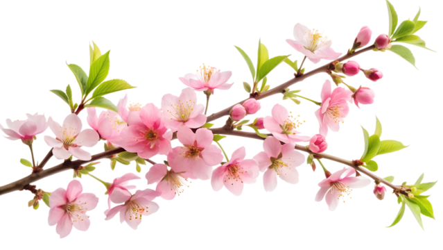 A closeup view of a blooming cherry blossom branch showcases its intricate pink petals and vibrant green leaves against a stark white backdrop isolated on