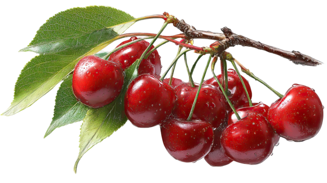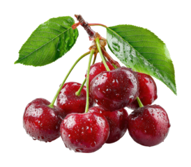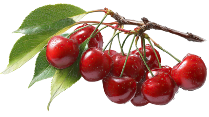 A bunch of fresh, ripe red cherries with green stems, glistening with water droplets, isolated on transparent background