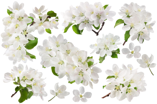 Branch with white flowers . Spring flowering of fruit trees. Delicate white flowers. Isolate on white.   PNG format available. Curved graceful branch