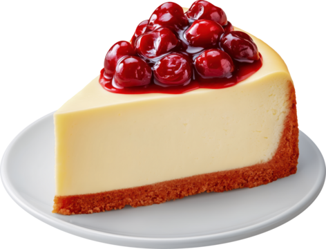 Fictional slice of New York Cheesecake with cherry topping on white plate. isolated PNG on a transparent background for menus, brochures, flyers, banners.