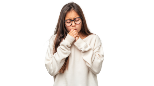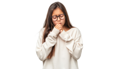 Young Asian woman coughing with hand covering mouth, suffering from dry cough or respiratory issue, isolated on transparent background