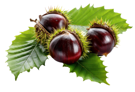 Chestnut Harvest: A trio of plump, freshly picked chestnuts, still nestled in their spiky husks, rest on a bed of vibrant green leaves. Ready to be roasted or enjoyed raw.