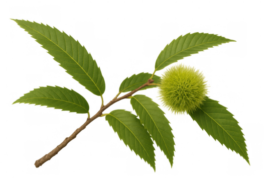 Close-up of a sweet chestnut branch featuring vibrant green leaves and an unripe, spiky burr, isolated on a transparent background