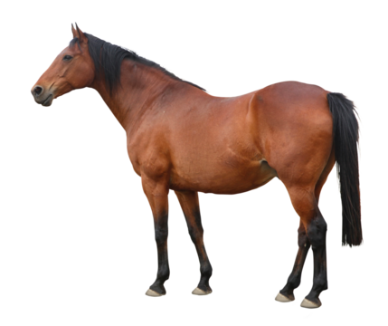 Isolated on white, a brown equine animal, a beautiful farm horse with a portrait head and flowing mane, stands as a majestic mammal