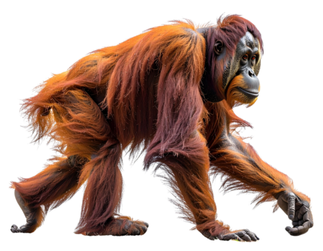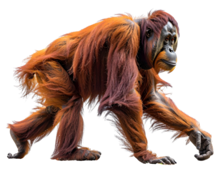 Orang-Utan in natürlicher Vierbein-Haltung beim Gehen, realistisch freigestellt auf transparentem Hintergrund