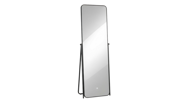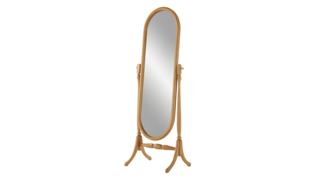 Sleek wooden cheval mirror with modern angular frame and bottom shelf on wheels, isolated on a transparent background