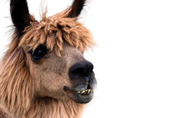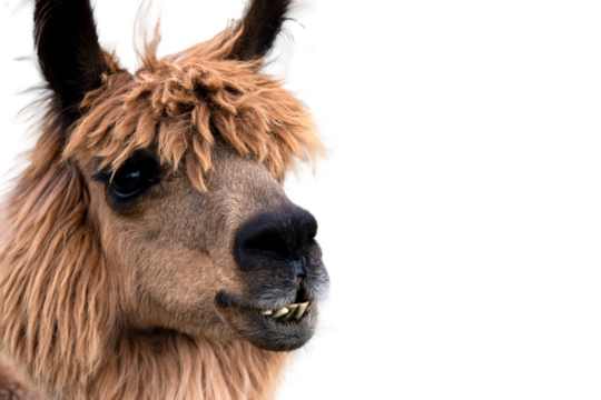 Portrait expressif d'un alpaga brun sur fond transparent, parfait pour des designs uniques et des projets graphiques créatifs.