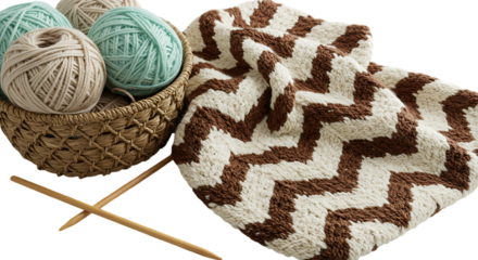 Handknitted ecofriendly scarf patterns knitting supplies with yarn and needles isolated on transparent background