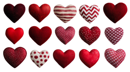 Red patterned heart set including stripes, polka dots, gingham, plaid, chevron, and crisscross designs. Hand painted watercolor decorative valentine element collection.