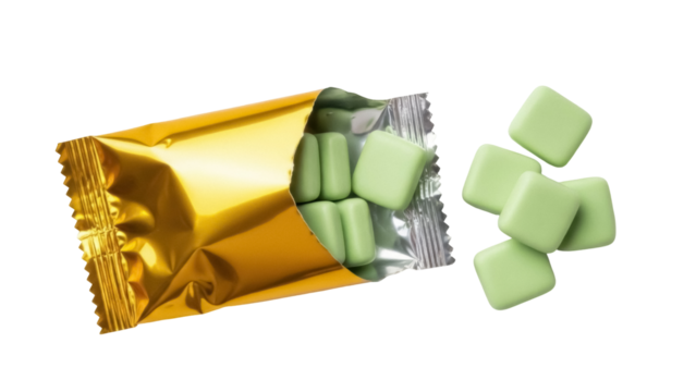 Isolated pouch of green chewing gum on table ready to eat for a refreshing treat sweet