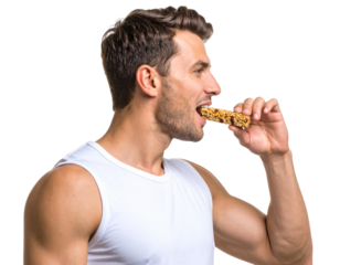 Athletic man eating a granola bar while wearing a sleeveless white shirt.