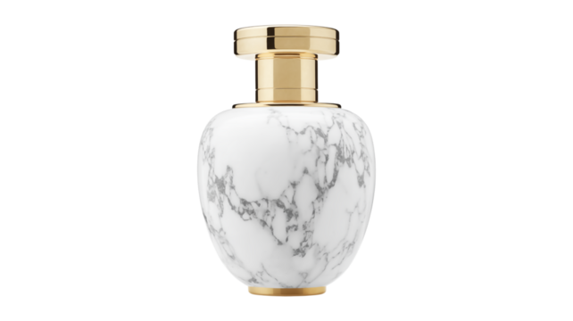 A product photo of a luxury perfume bottle with a white marble-textured body and gold accents. Isolated on a transparent background.