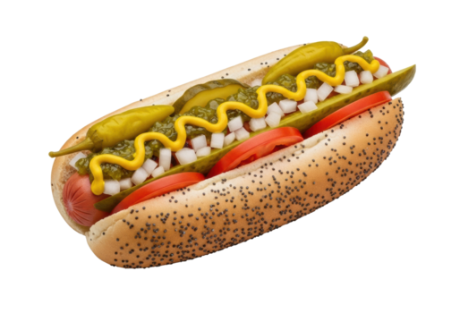 A plump Chicago-style hot dog on poppy seed bun, with classic toppings, on transparent, UHD studio product photo, food advertising concept