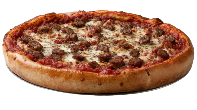 Delicious deep dish chicago style pizza piled with sausage and cheese - transparent background png