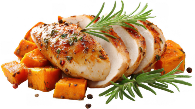 Sliced roasted chicken breast, seasoned with herbs and spices, paired with roasted pumpkin and fresh rosemary, presented on a transparent background