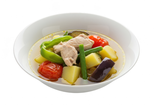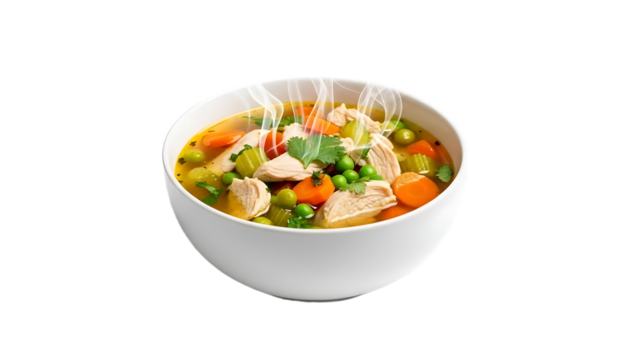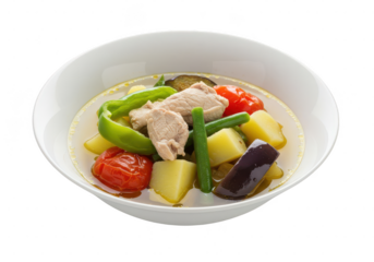 Close up of a bowl filled with chicken pieces and assorted vegetables in a light broth liquid on transparent background