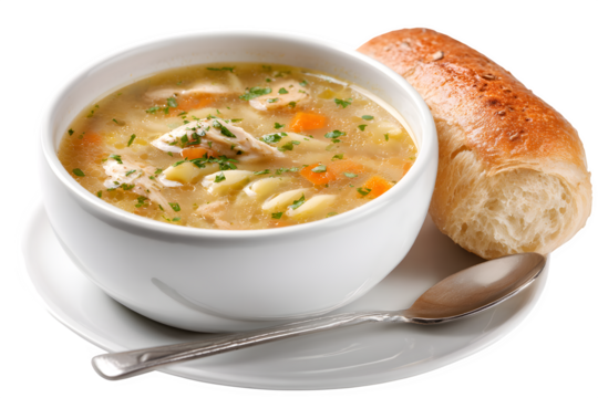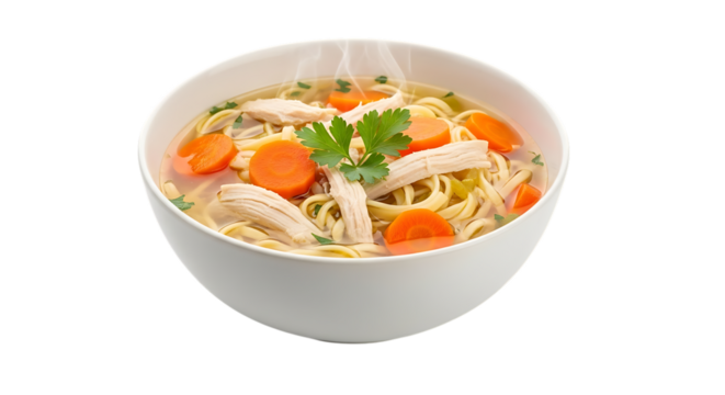 Hearty chicken noodle soup with carrots and parsley in a white bowl, isolated on a white or transparent background, cutout, PNG