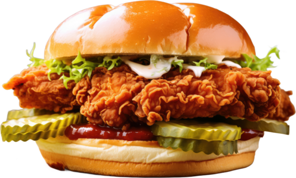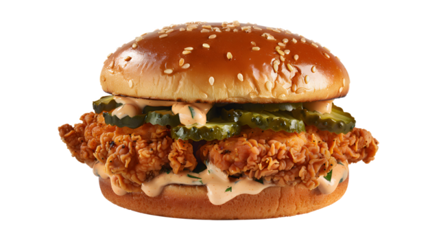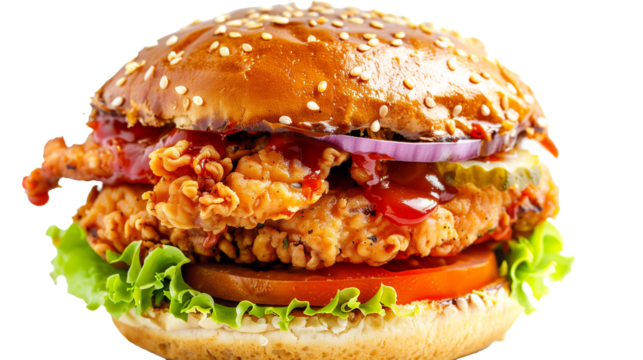 Southern fried chicken burger with sesame seed burger bun, background removed. Created with Generative AI technology