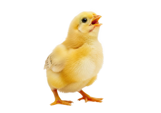 A cute fluffy yellow chick standing and chirping, isolated on transparent background