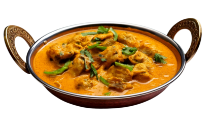 Delicious chicken tikka masala served in a traditional indian karahi dish isolated on transparent background