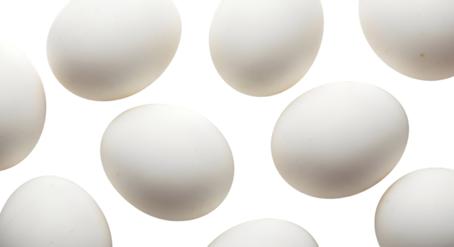 Five white chicken eggs arranged in a scattered pattern on black background food protein, Isolated On White Background, Png Transparent