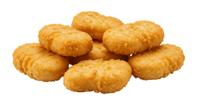 Crispy golden chicken nuggets stacked on transparent background