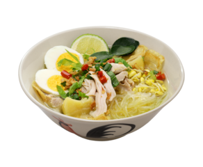 Soto Ayam, an Indonesian chicken noodle soup isolated on a transparent background