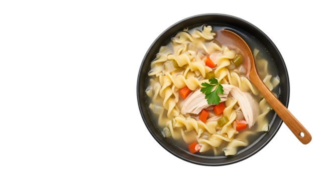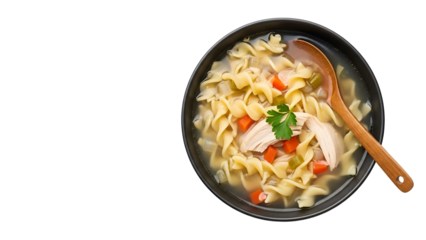 A bowl of homemade chicken noodle soup with a wooden spoon on transparent background