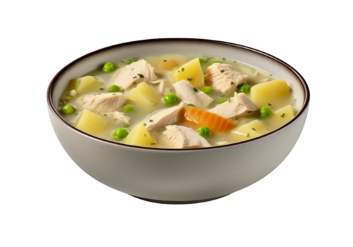 Delicious chicken and vegetable soup isolated on a white background, Png Transparent Background