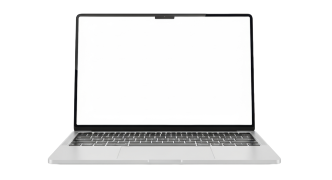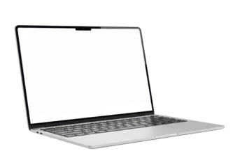 Sleek silver laptop, brushed aluminum, blank white screen, isolated on transparent studio background, soft reflections, ample copy space, professional technology concept