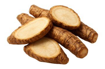 Close up of two chicory roots with leaves, isolated on a transparent background, ideal for healthy food and beverage projects