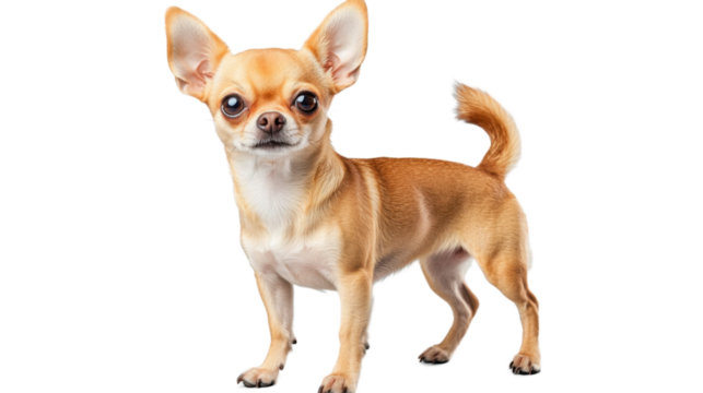 Chihuahua with chocolate and tan coloring, large ears, compact size, alert stance, short coat, isolated on a transparent background