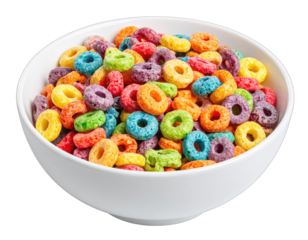 A white bowl filled with colorful, circular cereal pieces against a transparent background