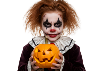 Young child in scary clown makeup holding a Halloween pumpkin isolated on transparent cutout background, cut out, png