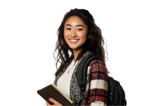 Young happy woman carrying backpack and notes on transparent background