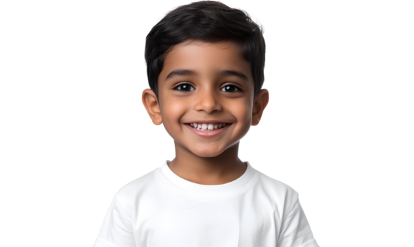Portrait of smiling boy with stained t-shirt, isolated on a white or transparent background