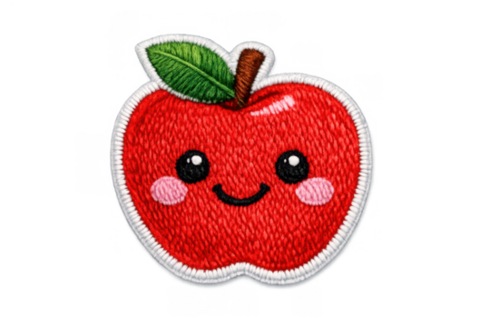Red apple patch featuring a friendly smiling face and blushing cheeks, showing a kawaii fruit character, isolated on transparent